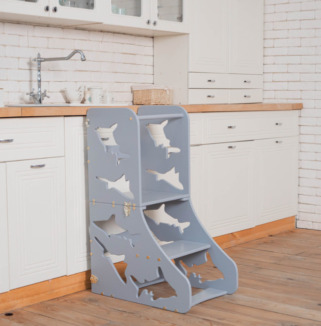 Это очень удобный элемент, который можно трансформировать в подставку для ребенка, чтобы помочь ему добраться до раковины и помыть посуду или почистить зубы; столик со стульчиком для обучения или еды или просто как игрушку.